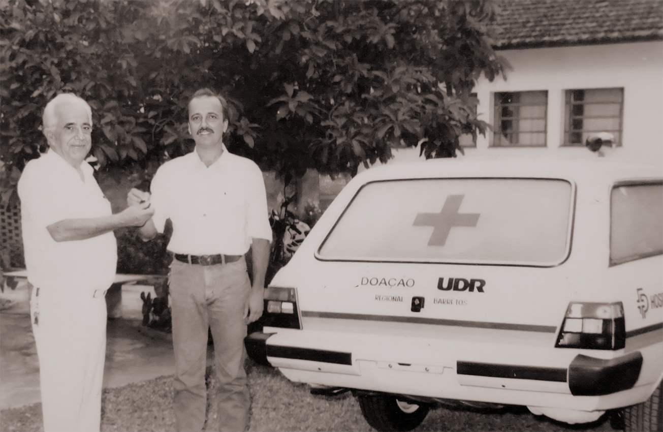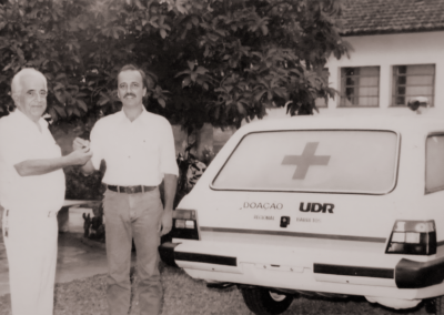 Dr. Paulo Prata e seu filho, Henrique Duarte Prata, durante a entrega de ambulância doada ao Hospital São Judas Tadeu, em outubro de 1989.