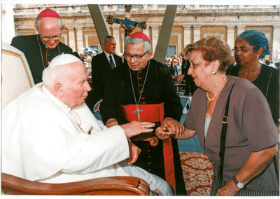 Dra. Scylla Prata, fundadora do Hospital de Amor, em viagem ao Vaticano, por volta do ano 2000. Em comitiva, estavam também Dom Antonio Maria Mucciollo, então Arcerbispo Emérito de Botucatu, e a sra. Angelina Mourão, governanta da Casa Episcopal, recebendo a benção de V. S. Papa João Paulo II.