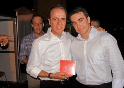 Henrique Prata e o 2º bispo diocesano de Barretos, dom Antônio Maria Mucciollo, entregam ao Padre Marcelo Rossi homenagem em nome do Hospital de Câncer de Barretos, em março de 2001.
